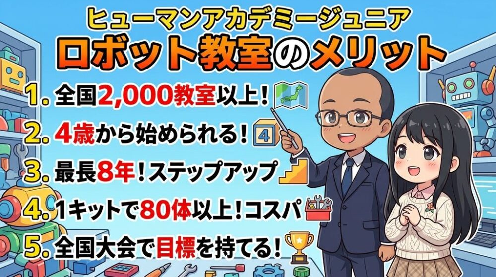 ヒューマンアカデミージュニア ロボット教室のメリットは、次の5つです。